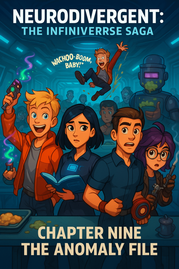 Ty—Tyrian Nox, the chaos incarnate in a too-small jacket and highlighter-orange sneakers—exploded off the hover-bench mid-sneeze. Limbs flailed as he twisted into an accidental triple backflip, arms pinwheeling like rotor blades. He shrieked in midair, the sound unhinged, as if a dolphin had consumed one too many energy drinks and discovered interstellar jazz.